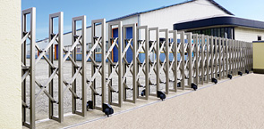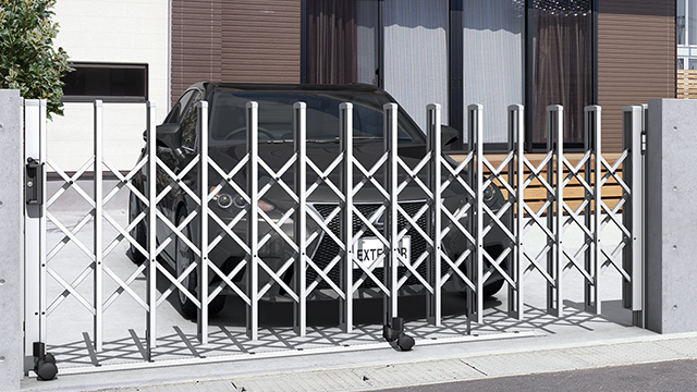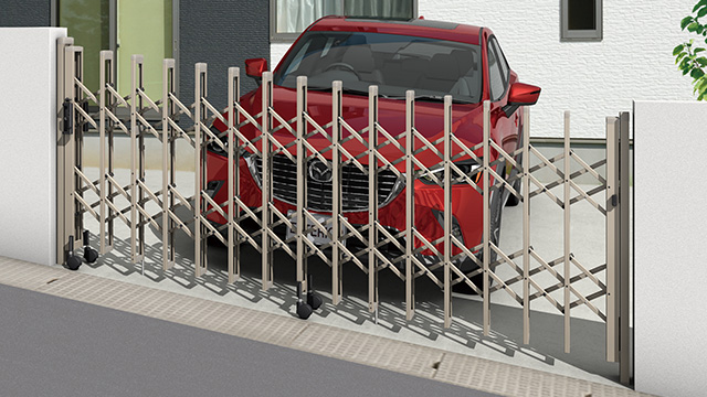 大開口に対応できる丈夫さを備えた大型カーテンゲート。防犯性も強化できる優れもの。