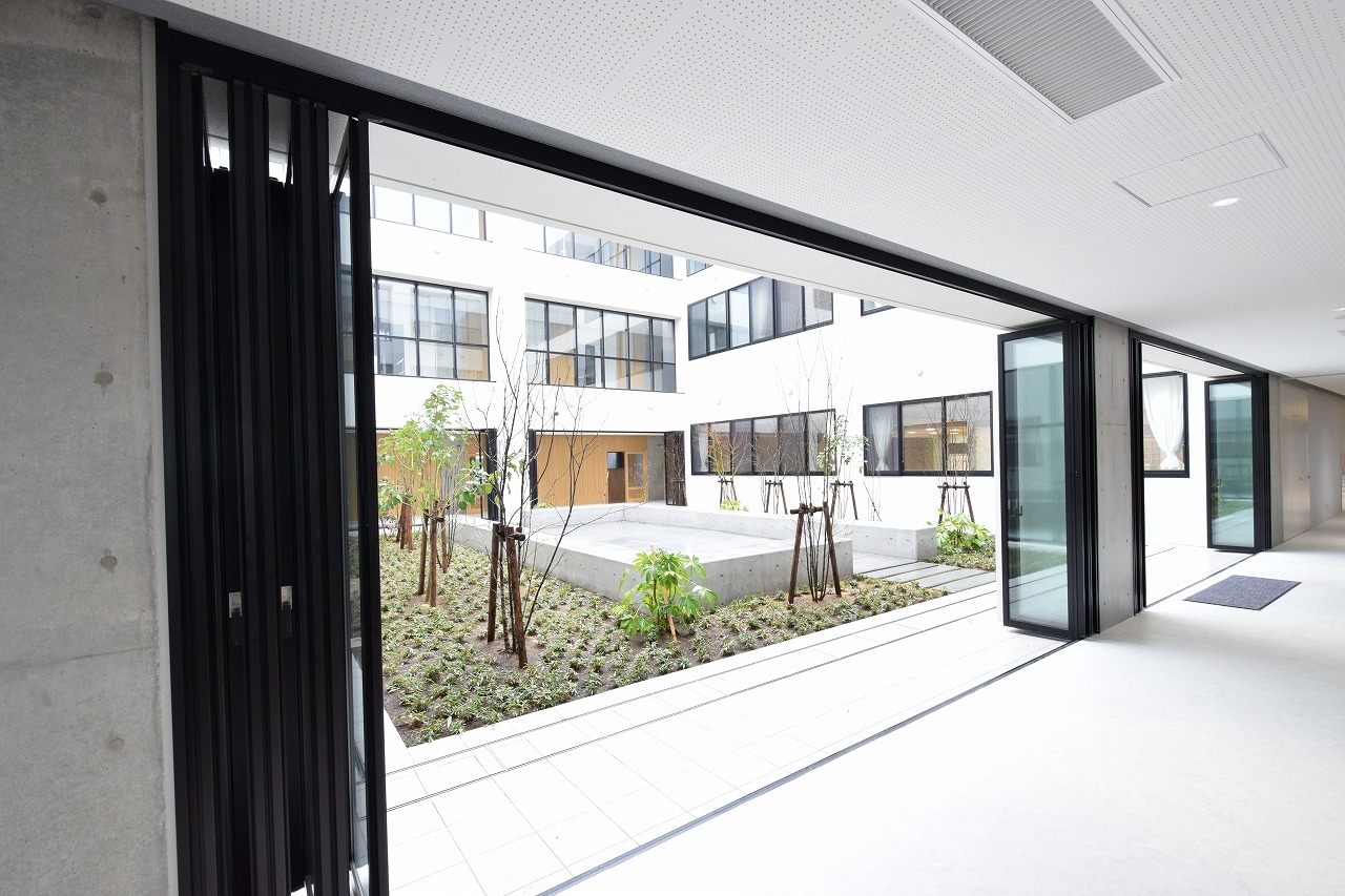 人口増加に伴う新設学校。光と風が抜ける“セミオープンスペース”としてデザインされた中庭では、自然とコミュニケーションが広がります。