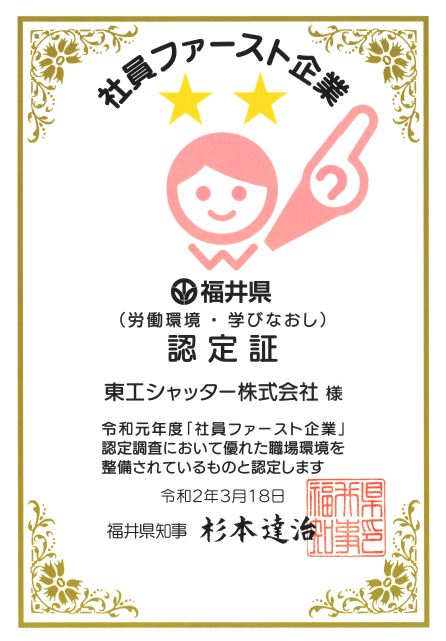 福井県から、社員を大切にし働きやすい職場環境づくりを進める企業として、「企業環境」と「学びなおし」部門で『社員ファースト企業』の認定を受けました。